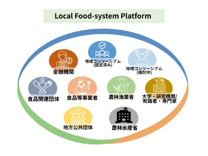 本プラットフォームは、地域の持続可能な食料システムの構築に取り組む多様な関係者が連携・参画する場です。地域コンソーシアム、地方公共団体、食品関連団体、金融機関、大学・研究機関などの支援機関や団体に加え、農林漁業者や食品事業者等の事業者が、それぞれの立場で地域の食品産業の振興に取り組みます。