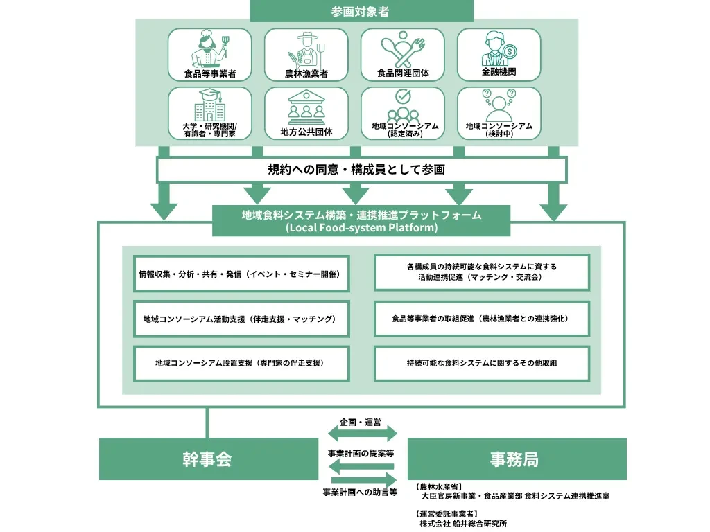 また本プラットフォームは「食料システム法」の連携支援事業を活用し、地域での協働体(コンソーシアム)の設立や活動を後押しします。