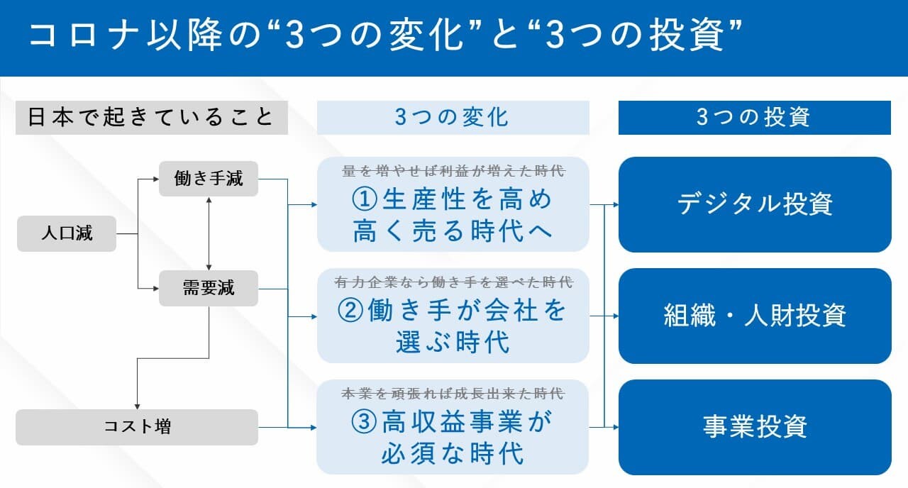 人口減少に伴い、働き手と市場の需要そのものが減少しています。これにより、採用コストは増大し、単純に診療数を増やせば利益が上がるという時代ではなくなりました。