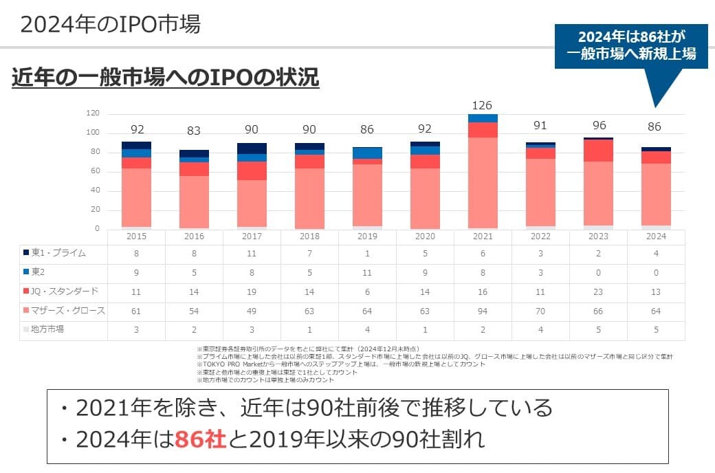 一般市場における新規上場企業数は、2020年まで年間90社前後で推移していましたが、2021年には126社に増加しました。 2024年は86社と、2019年以来の90社を下回る水準でした。