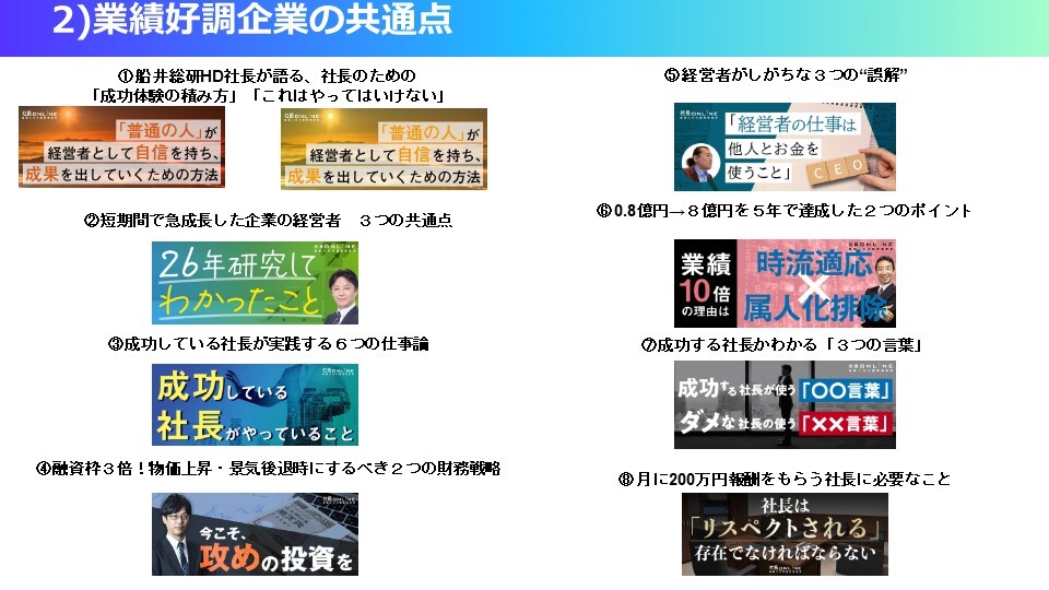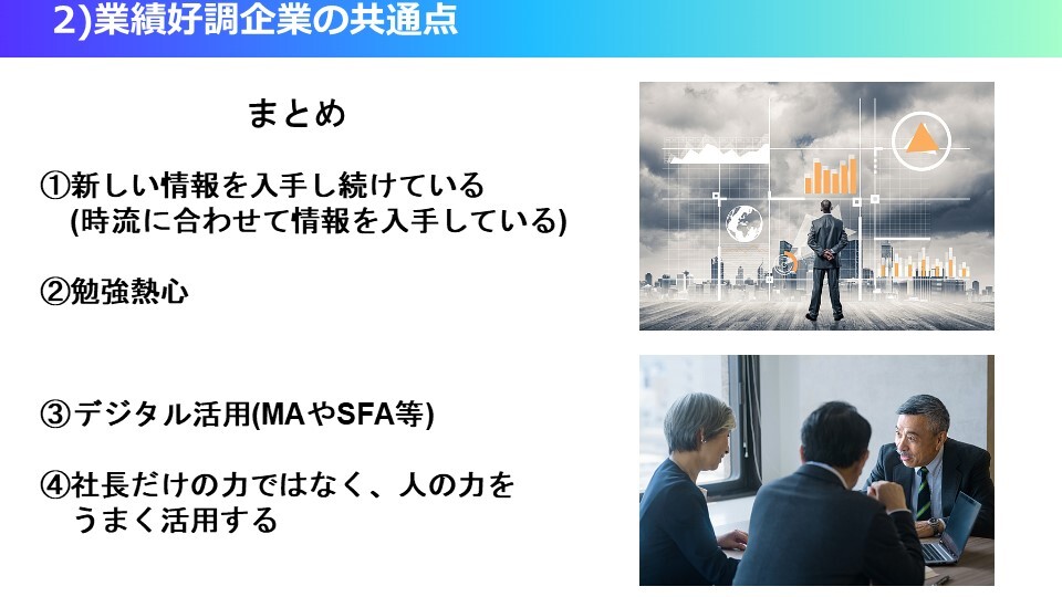 先にまとめをお話しさせていただきますと、ご紹介させていただく記事には大きく分けて4つの共通点があります。1つ目にこれらの記事では新しい情報、時流に合わせた情報を入手し続けています。2つ目が勉強熱心な方が多いということです。3つ目がデジタルの活用というところで、MAやSFAをしっかりと活用している会社が多いです。4つ目に、社長だけの力ではなくて人の力というのをうまく利用している社長様が多いです。では詳細についてお伝えしていきます。