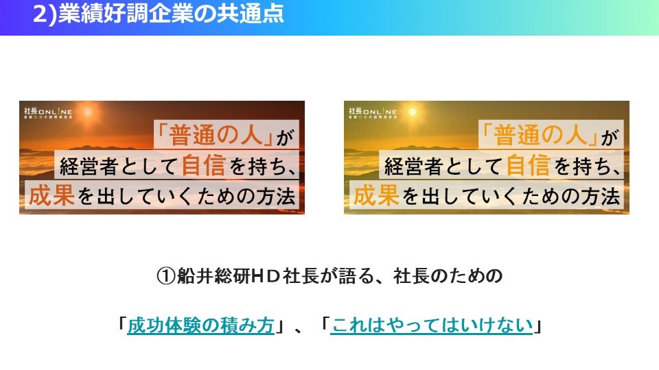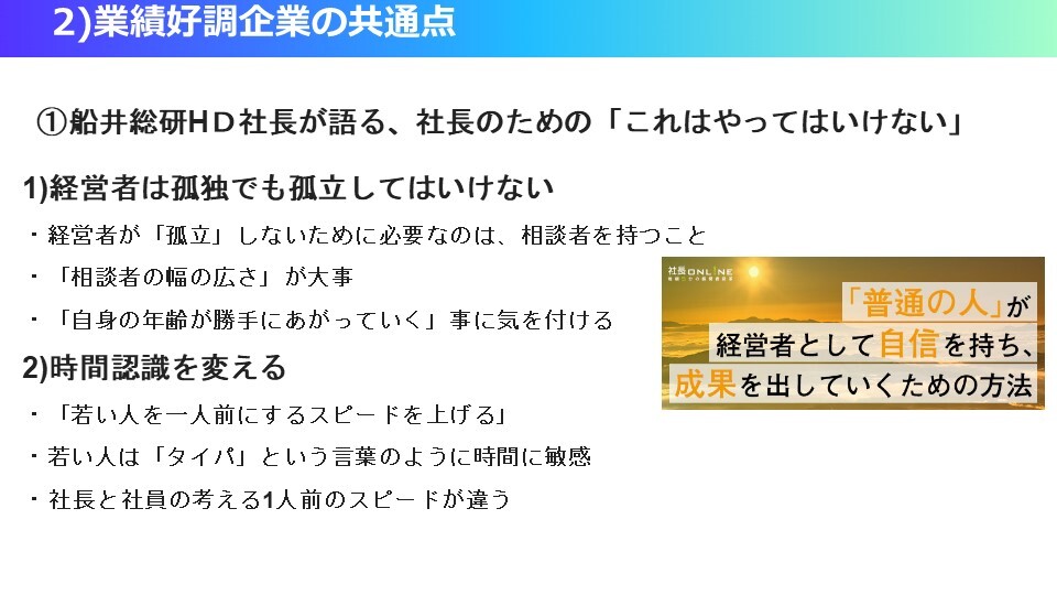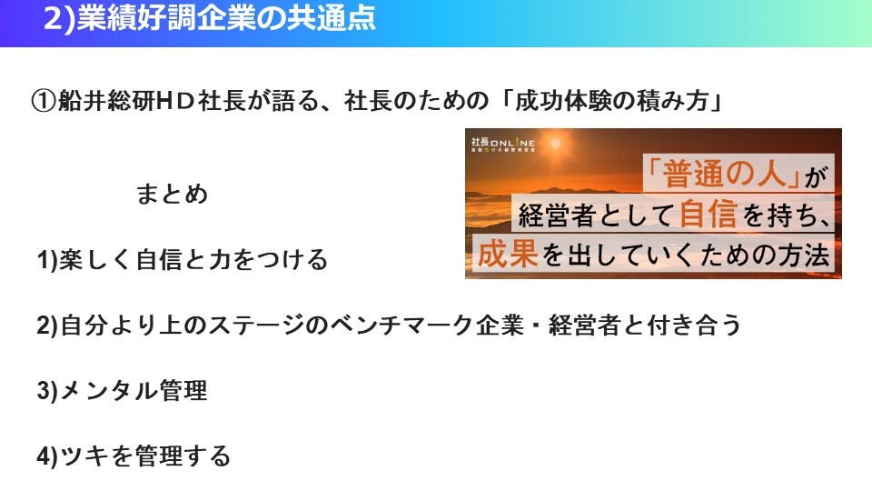 まず1つ目です。船井総研ホールディングス社長が語る社長のための成功体験の積み方と、これはやってはいけない、ということについてお伝えしていきます。成功体験の積み方については実際に社長onlineの記事を見ながらご紹介いたします。