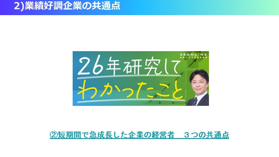 2つ目の、「ワンステージ上の経営者と付き合う」ということに関しては、しっかりとワンステージ上の経営者を見つけていただいてベンチマークをするということになります。そうすることで半分成功は決まったようなものというところでございます。3つ目と4つ目に関してはぜひ引き続き社長onlineを無料お試しいただいてご視聴いただければと思います。