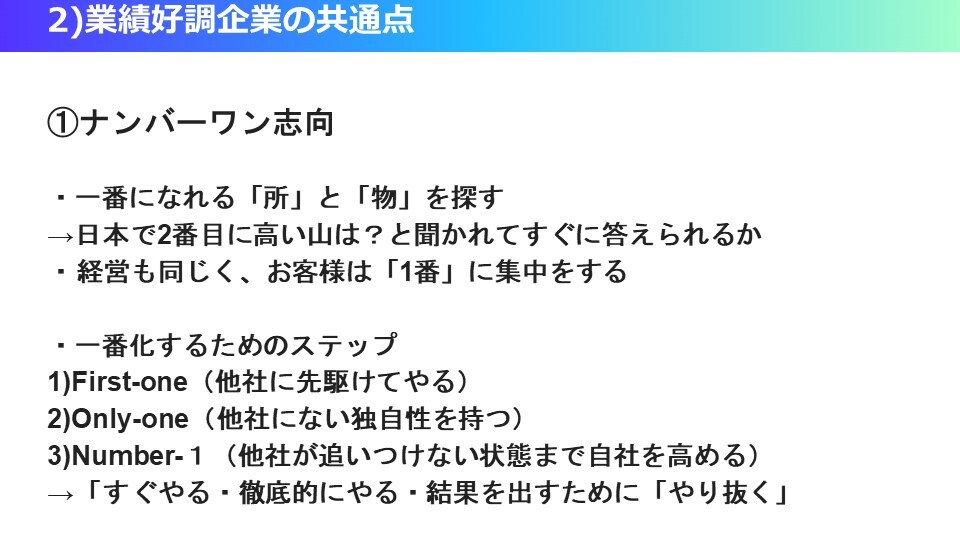 1つ目がナンバーワン志向です。一番になれる「所」と「物」を探すということが大事です。「日本で1番高い山は」と聞かれた場合、すぐに皆様は「富士山」と答えられるかと思います。では、「日本で2番目に高い山はどこですか」と聞かれてすぐに答えられる方はどれぐらいいらっしゃいますでしょうか。