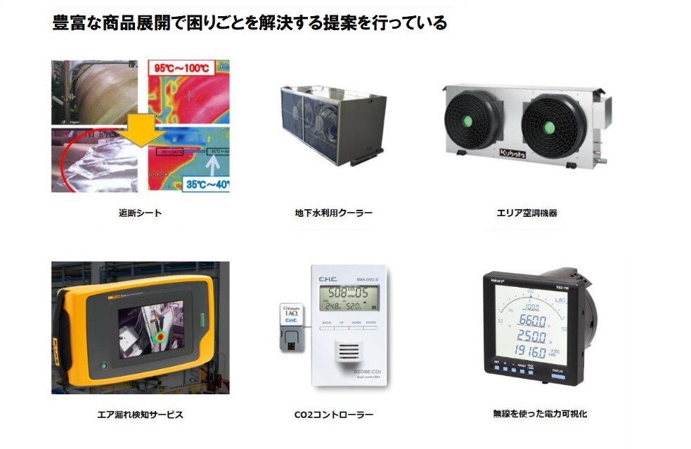 メインの空調工事だけでなく、電気工事・衛生工事・消防設備・注文住宅事業、リフォーム事業と多角的に事業展開している。近年、脱炭素市場に参入し、地域の工場向けに省エネ設備を提案する事業の立ち上げにも注力している。