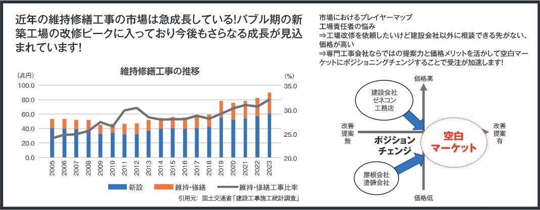また、従来の「付き合いのある業者に頼む」時代から、施設管理担当者が自ら情報を集めて発注先を選ぶ時代へと変化しており、専門工事会社ならではの提案力と価格メリットを活かして空白マーケットにポジショニングチェンジすることで、受注が加速します。