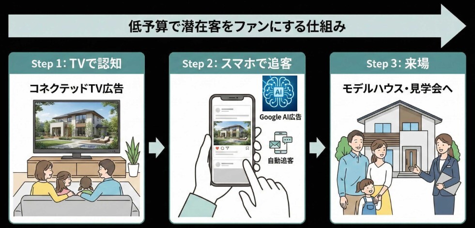 地上波のTVCMのような大きな予算は不要です。商圏エリアの「家づくりに興味がありそうな人」だけに絞って、自宅リビングの大きなテレビ画面にCMを流すことで、低予算で「地域の有名店」になるためのコネクテッドTV活用法がわかります。