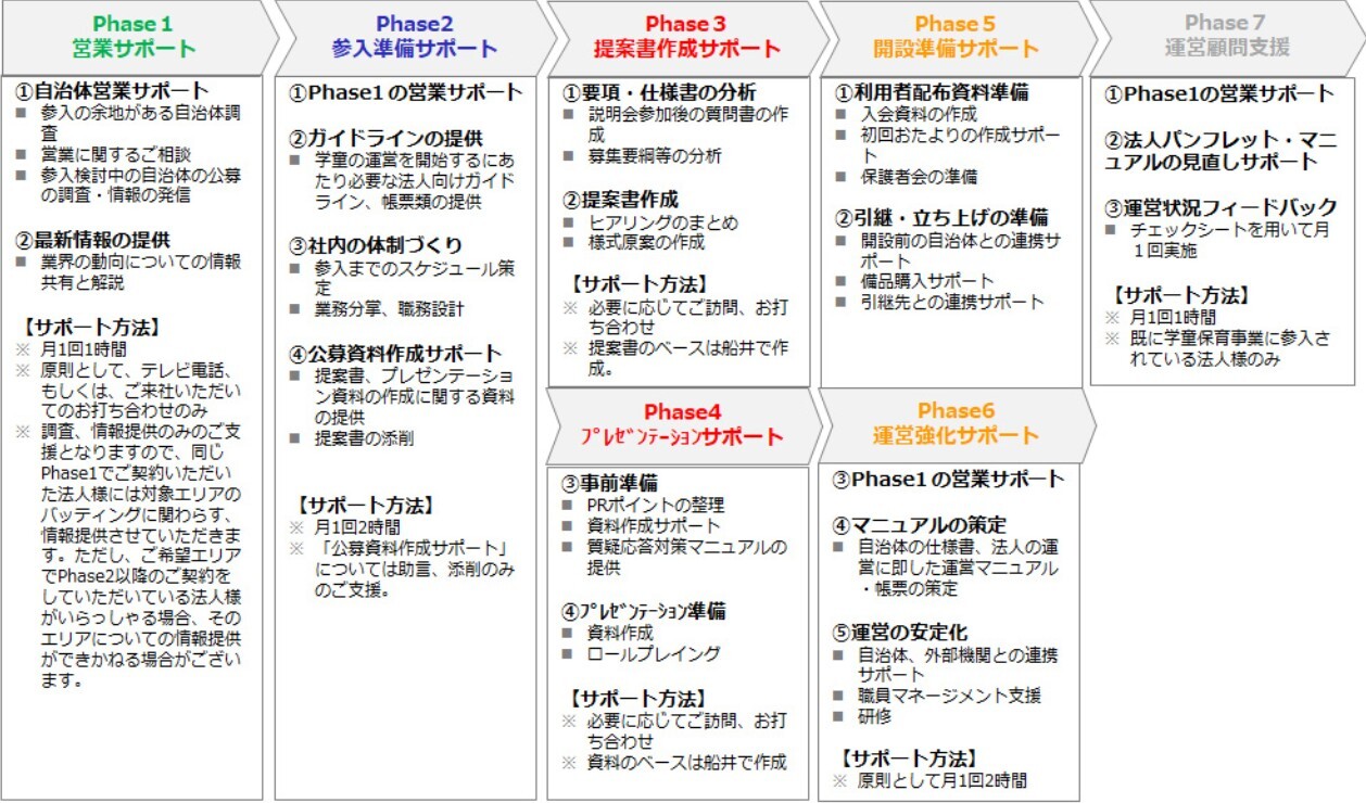 一口に「学童保育所の開設」と言っても、抱える課題は法人様によって様々。「具体的に参加したい公募がある!」という方から、「ぼんやりと検討し始めた段階」という方もいらっしゃるかと思います。弊社では皆様の抱える課題に合わせたサポートをご用意し、開設を検討される皆様をトータルでサポートする体制を整えております。