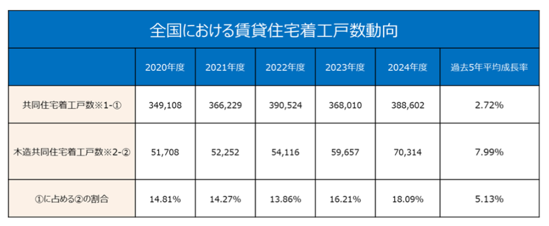 全国における木造の賃貸住宅着工戸数は過去5年で平均7%以上成長しており、共同住宅戸数全体の着工戸数で見ても、過去5年で平均2%以上成長しています。