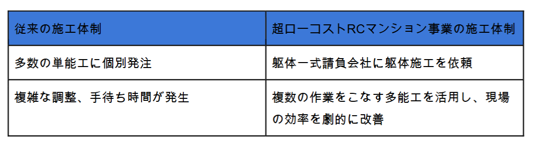 この事業は、建築費高騰や利回り悪化といった構造的な課題に対し、設計と施工の両面から抜本的にアプローチすることで、条件によっては、「木造並み」のコミコミ坪65万円という超ローコストなRCマンション建築も可能となります。