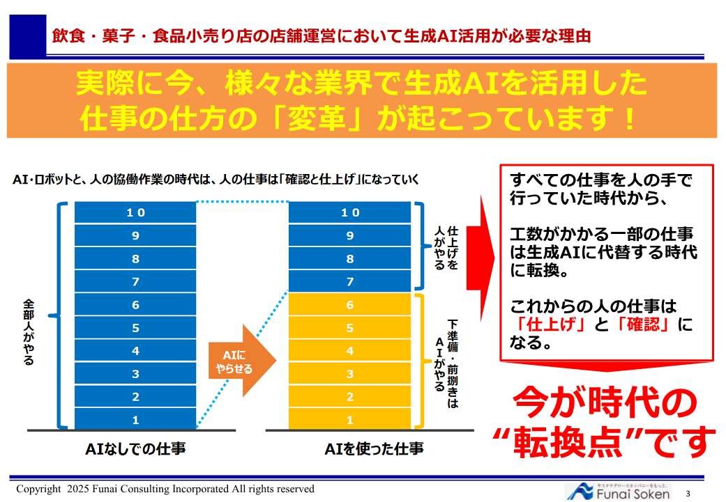 現在、飲食・菓子・食品小売業界は、慢性的な人手不足と原材料費・光熱費などのコスト高騰という二重苦に直面しています。労働人口の減少は採用難を加速させ、既存スタッフへの負担増や離職率の上昇を招き、採用・育成コストも増大しています。また、利益率の圧迫は持続可能な経営を困難にしています。このような状況で、従来の経営手法だけでは限界があります。今後、企業が生き残り成長するためには、生成AIのような革新的な技術を導入し、業務の自動化・半自動化、データに基づいた意思決定を通じて、人手不足の中でも売上を維持・向上させ、コストを抑制し、質の高い顧客サービスを提供することが不可欠となるでしょう。