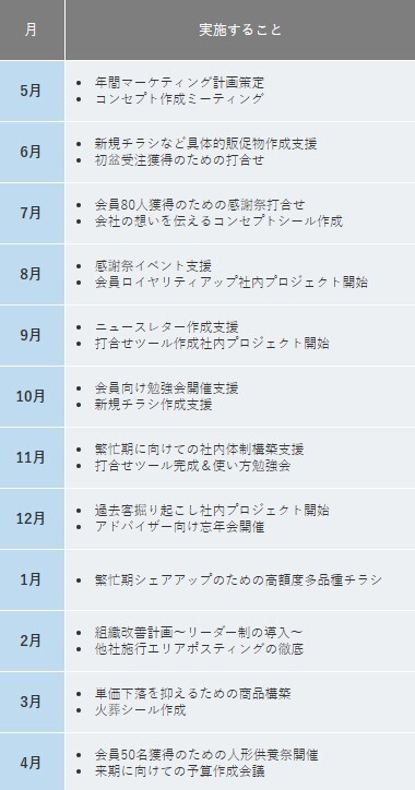 貴社が業績を上げ、貴社のミッション・ビジョンを達成するための支援を、経営参謀として行うのが月次支援コンサルティングです。とはいえ、口だけのアドバイスではなく、実際、葬儀社で修行を積んだコンサルタントが、チラシのラフ作成、研修、出店候補地の分析、そして時には、銀行との交渉など、現場レベルのことから会社の経営戦略にいたるあらゆる側面からフォローさせていただきます。