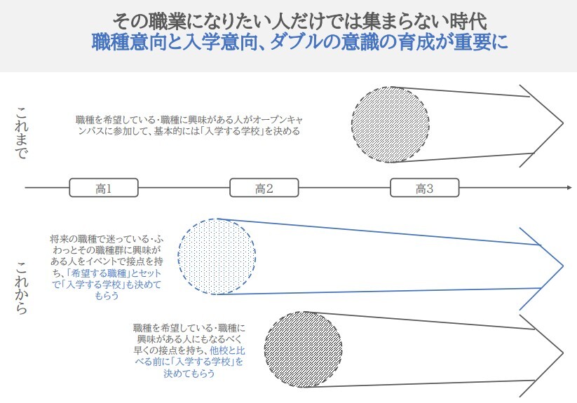 これまでの専門学校の募集活動は、「すでにその職種を希望している、または興味がある人」がオープンキャンパスに参加し、「入学する学校」を決めるという流れが主流でした。