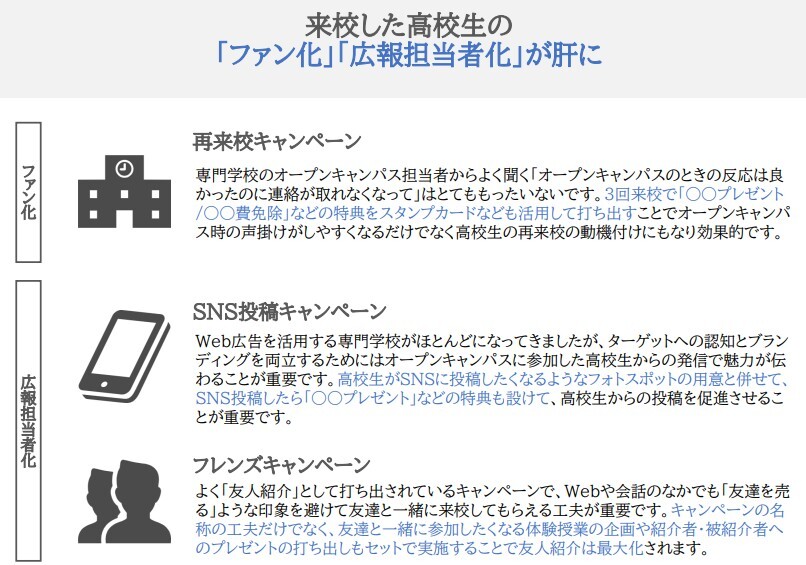 オープンキャンパス(OC)などで良い反応を示した高校生が、その後連絡が取れなくなるケースは、多くの専門学校様で散見される「もったいない」機会損失です。船井総研では、来校者名簿を最大限に活かし、高校生を「ファン」から「広報担当者」へと転換させるための「ファン化キャンペーン」の導入を具体的にサポートします。