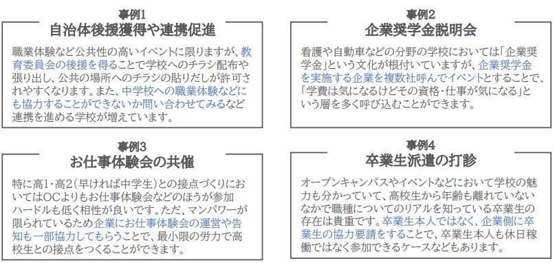 下記事例のように企業や行政に頼って、入学者を集める工夫をご紹介します。