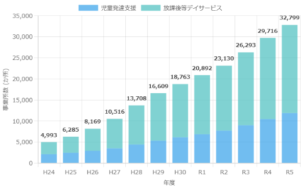 具体的には、平成 26 年(2014 年)から令和 5 年(2023 年)までの 9 年間で、利用者数は約 10 万人から約51万人へと増加、そして事業所数は約 5,000 カ所から約33,000カ所へと、利用者数は5倍・事業所数は6.6倍にまで拡大しました。