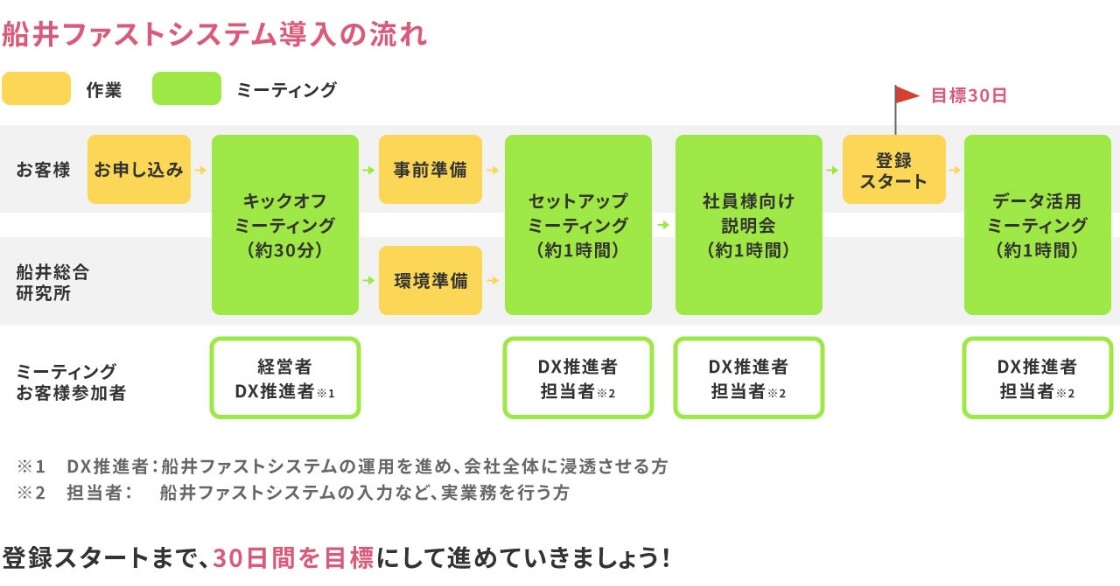 | ミーティング (1回目) | 船井総研 事業責任者 | 1カ月目 | 船井ファストシステム概要のご案内 開発するアプリ機能(入金管理・営業進捗管理等)の具体的な方法・使用手順のご説明 アプリを活用する上でのご要望を整理 |