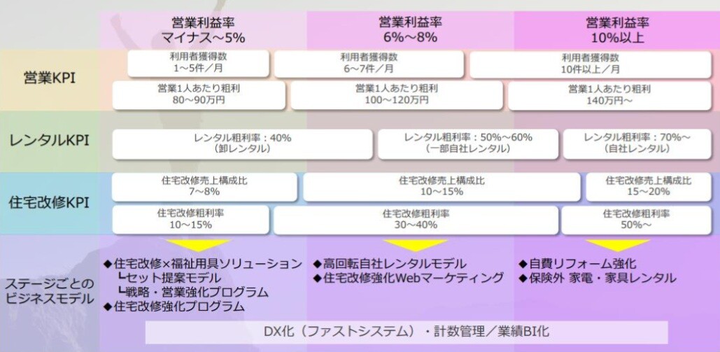 レンタル粗利率をさらに向上させ、住宅改修も強化し、高収益化を達成します。