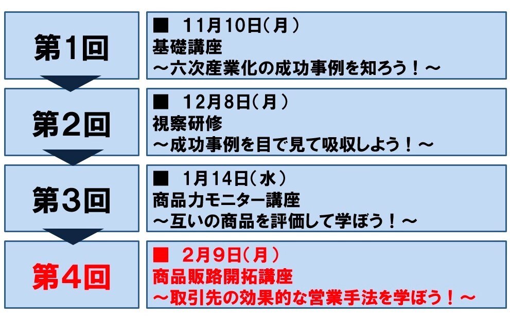 農業が盛んであり、多様な作物を産出する地域ながら、ほとんどが農産物のまま出荷されていた。そこで、有志の農業団体を10団体程度募り、4回にわたる勉強会を開催した。勉強会では、基礎学習、視察、方向性検討からバイヤーを招いてのプレゼンテーションまでを行い、商品化を促進した。