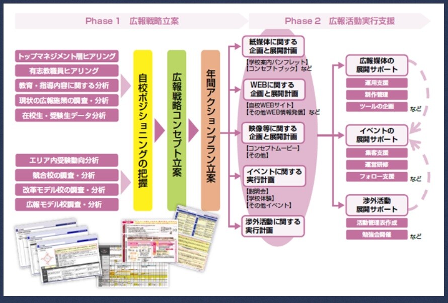 生徒募集・学生募集に関する課題は、単に広報施策の内容を見直すだけでは根本的な解決にはなりません。学校が伝えるべきコンセプトを明確化し、広報体制を構築し、オープンキャンパスや学校説明会を中心として集客・企画・運営・アフターフォローを通じて受験・出願決定率を即時向上させることができ、中長期的にも安定した生徒募集・学生募集体制の構築が可能です。