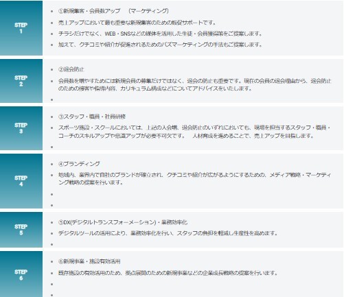 そのコンサルティング対象分野は幅広く、学習塾、英会話、プログラミング、幼児教室、フィットネス・スポーツ教室、幼稚園・こども園、専門学校、資格スクール、保育施設など多くの教育・スクール・保育分野のコンサルティング実績を持っている。