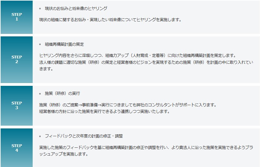 船井総合研究所の人財育成・人財定着コンサルティングでは、現状の組織に関するお悩みや課題を伺った上で、貴法人の考える理想の組織や将来生き残る法人になれるようにサポートいたします。