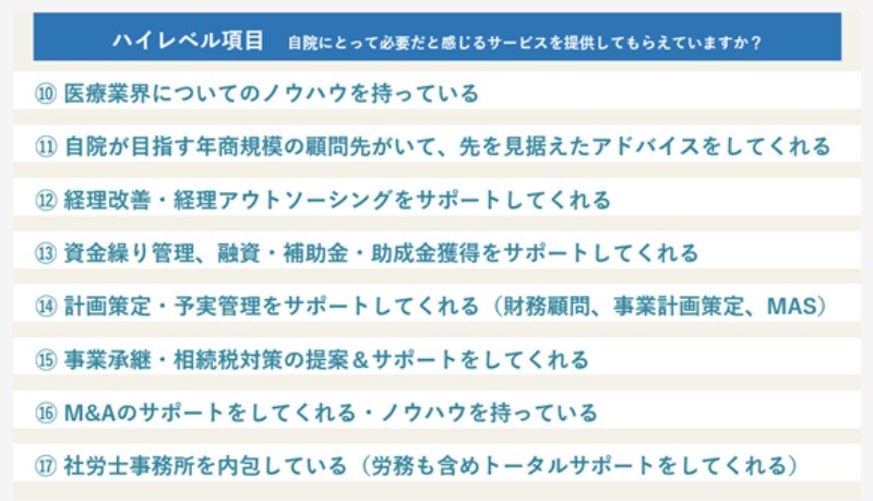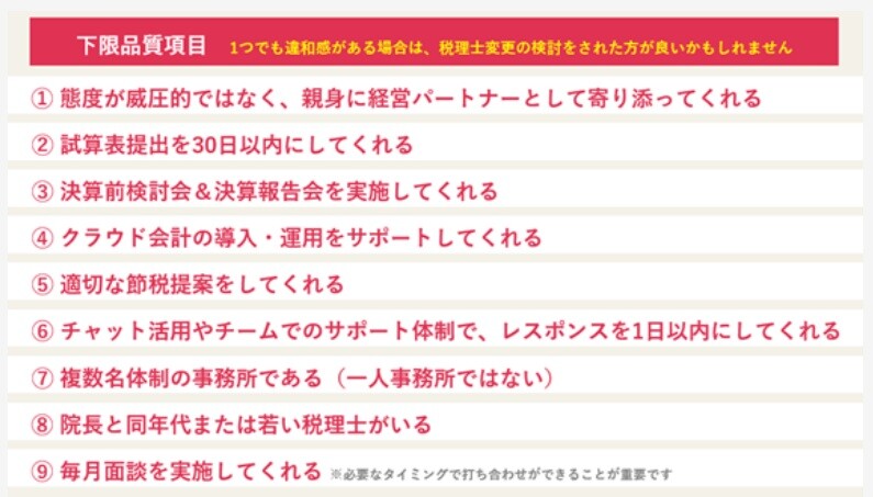 船井総研がご紹介する厳選した優良税理士事務所は、下記の下限品質項目をクリアしており、企業成長にとって必要なハイレベル項目のサービス提供をしてくれます。