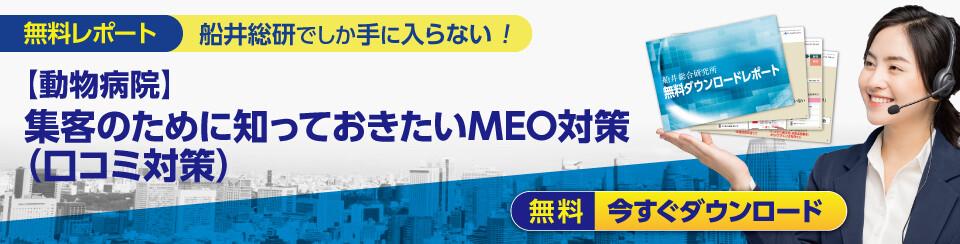 私たち船井総合研究所は、動物病院業界に特化したコンサルティンググループを擁しており、マーケティングやWebに特化したプロ集団が、先生の病院に最適なMEO対策をご提案いたします。