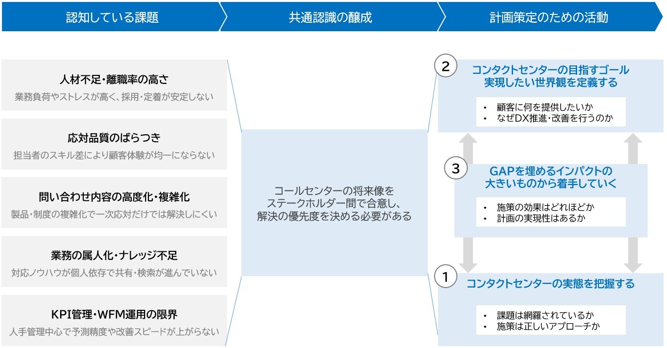- コンタクトセンターの戦略構築は、経営・現場・顧客からの期待を理解し、実現するための計画が必要です
